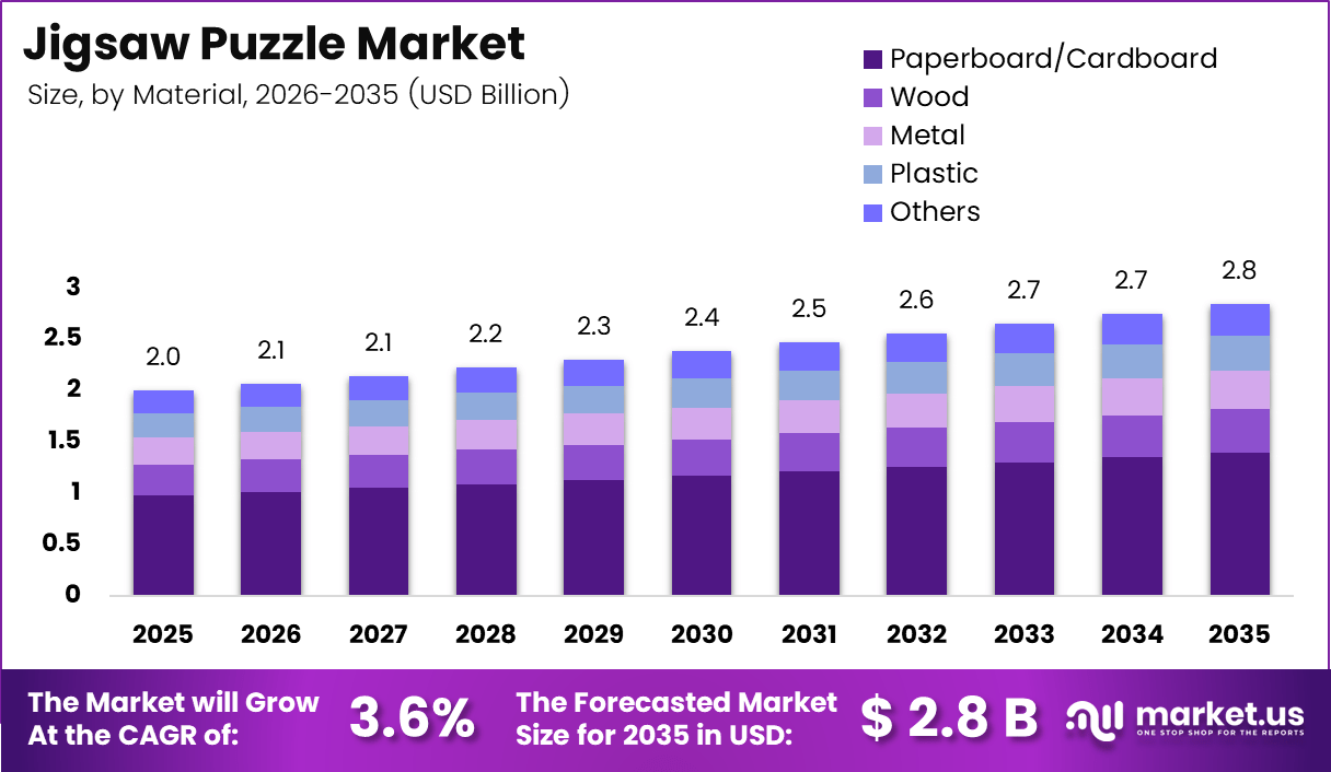 The Global Jigsaw Puzzle Market size is expected to be worth around USD 2.8 billion by 2035, from USD 2.0 billion in 2025, growing at a CAGR of 3.6% during the forecast period from 2026 to 2035.