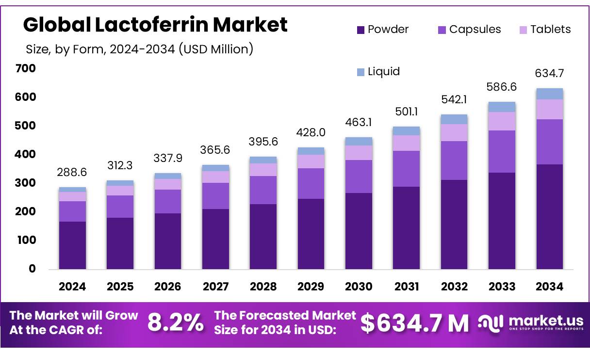 - Lactoferrin Market size is expected to be worth around USD 634.7 Million by 2034, from USD 288.6 Million in 2024, growing at a CAGR of 8.2%.