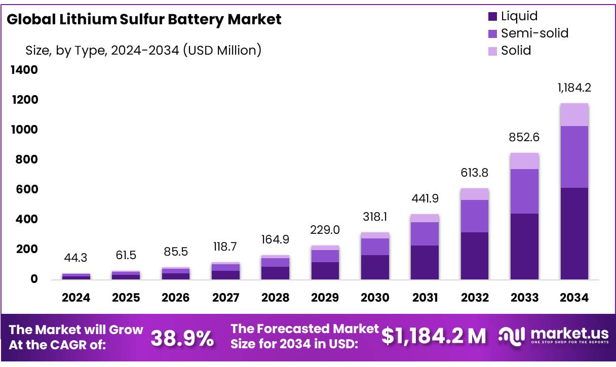 - The global lithium-sulfur battery market is projected to grow from USD 44.3 million in 2024 to USD 1184.2 million by 2034, with a CAGR of 38.9%.