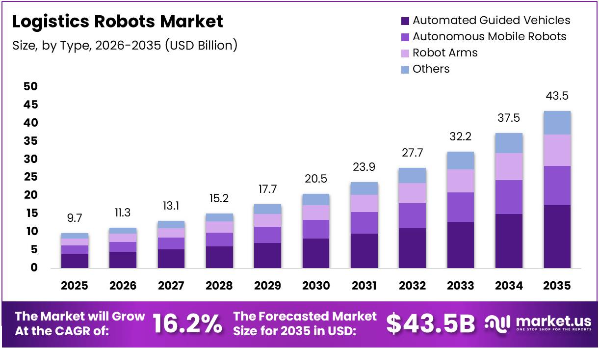 The Global Logistics Robots Market size is expected to be worth around USD 43.5 Billion by 2035, from USD 9.7 Billion in 2025, growing at a CAGR of 16.2% during the forecast period from 2026 to 2035.