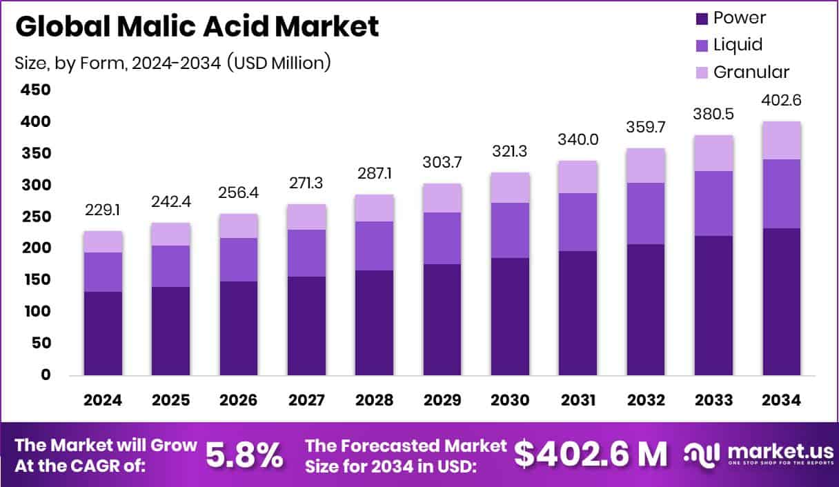 - Global Malic Acid Market is expected to be worth around USD 402.6 Million by 2034, up from USD 229.1 Million in 2024, and grow at a CAGR of 5.8% from 2025 to 2034.
