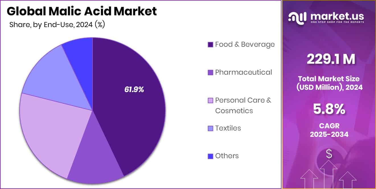 In 2024, Food and Beverage held a dominant market position in the By End Use segment of the Malic Acid Market, with a 61.9% share. This leading share reflects the widespread use of malic acid as a flavor enhancer and acidulant in processed foods and beverages.