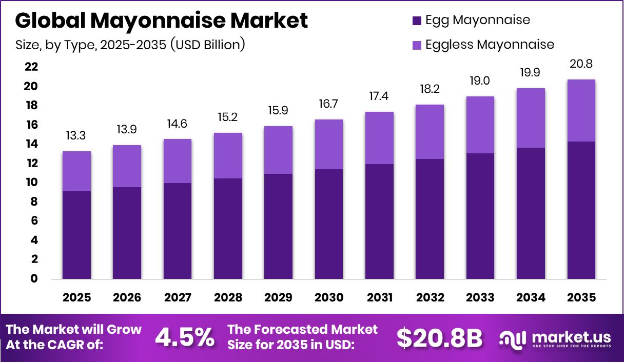 - The Global Mayonnaise Market is expected to be worth around USD 20.8 billion by 2034, up from USD 13.3 billion in 2024, and is projected to grow at a CAGR of 4.5% from 2025 to 2034.