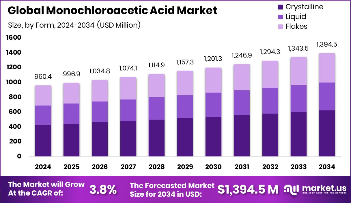 - Global Monochloroacetic Acid Market is expected to be worth around USD 1,394.5 Million by 2034, up from USD 960.4 Million in 2024, and grow at a CAGR of 3.8% from 2025 to 2034.