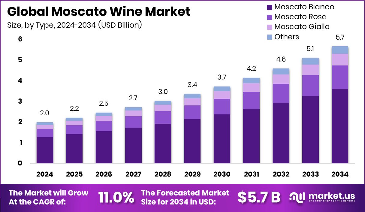 - The Global Moscato Wine Market is expected to be worth around USD 5.7 billion by 2034, up from USD 2.0 billion in 2024, and is projected to grow at a CAGR of 11.0% from 2025 to 2034.