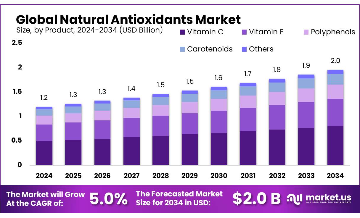 - Natural Antioxidants Market size is expected to be worth around USD 2.0 Billion by 2034, from USD 1.2 Billion in 2024, growing at a CAGR of 5.0%.