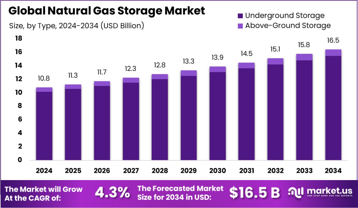- Global Natural Gas Storage Market is expected to be worth around USD 16.5 billion by 2034, up from USD 10.8 billion in 2024, and grow at a CAGR of 4.3% from 2025 to 2034.