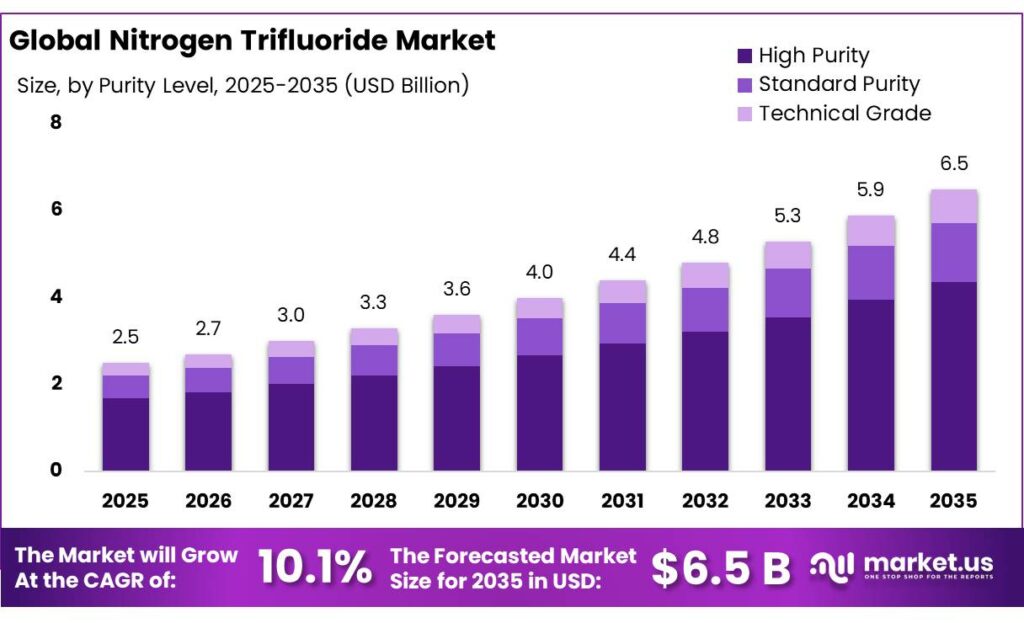 Report Features Description Market Value (2025) USD 2.5 Bn Forecast Revenue (2035) USD 6.5 Bn CAGR (2026-2035) 10.1% Base Year for Estimation 2025 Historic Period 2020-2024 Forecast Period 2026-2035 Report Coverage Revenue Forecast, Market Dynamics, Competitive Landscape, Recent Developments Segments Covered By Purity Level (High Purity, Standard Purity, Technical Grade), By Application (Semiconductor Chips, Flat Panel Displays, Solar Cells, Others), By End Use (Electronics, Telecommunications, Automotive, Aerospace, Others), By Distribution Channel ( Direct Sales, Distributors, Online Sales) Regional Analysis North America – US, Canada; Europe – Germany, France, The UK, Spain, Italy, Rest of Europe; Asia Pacific – China, Japan, South Korea, India, Australia, Singapore, Rest of APAC; Latin America – Brazil, Mexico, Rest of Latin America; Middle East & Africa – GCC, South Africa, Rest of MEA Competitive Landscape Mitsui Chemicals Inc, American Gas Group, Central Glass Co. Ltd, Formosa Plastics Corporation, Kanto Denka Kogyo Co. Ltd, SK Materials, Foosung Co. Ltd, HYOSUNG, Linde plc, Navin Fluorine International Limited, OCI COMPANY Ltd. Customization Scope Customization for segments, region/country-level will be provided. Moreover, additional customization can be done based on the requirements. Purchase Options We have three licenses to opt for: Single User License, Multi-User License (Up to 5 Users), Corporate Use License (Unlimited User and Printable PDF)