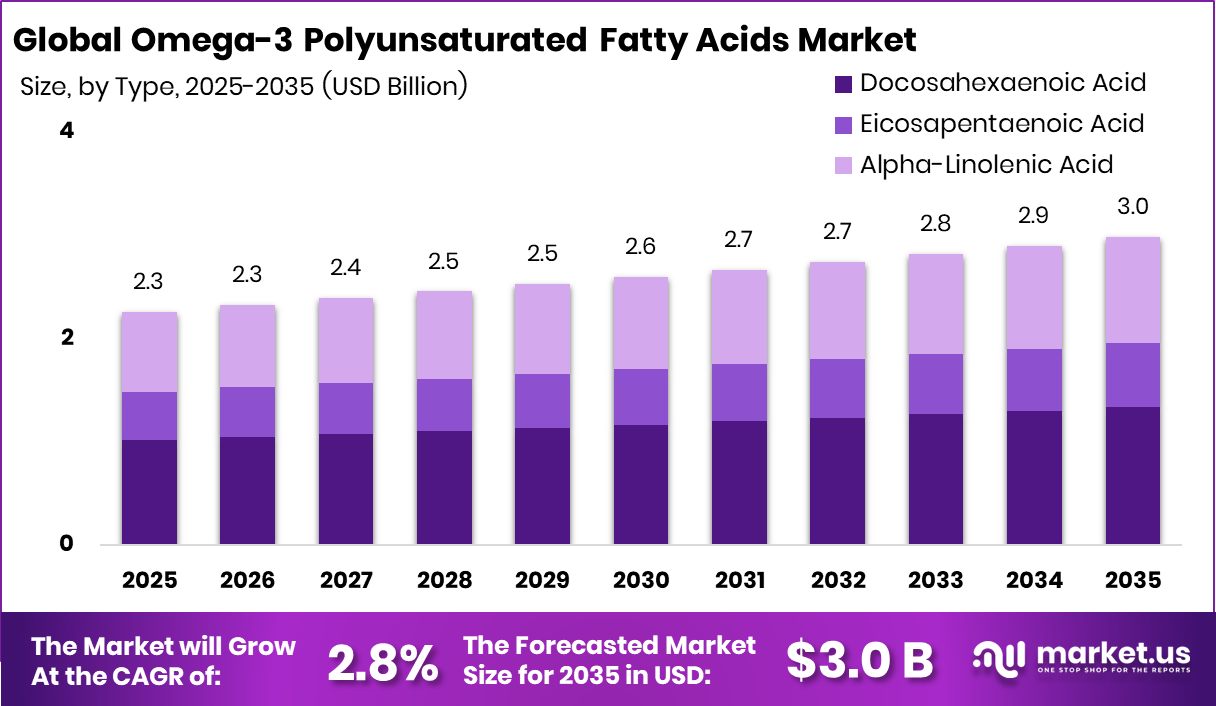 - The Global Omega-3 Polyunsaturated Fatty Acids Market is expected to be worth around USD 3.0 billion by 2034, up from USD 2.3 billion in 2024. It is projected to grow at a CAGR of 2.8% from 2025 to 2034.