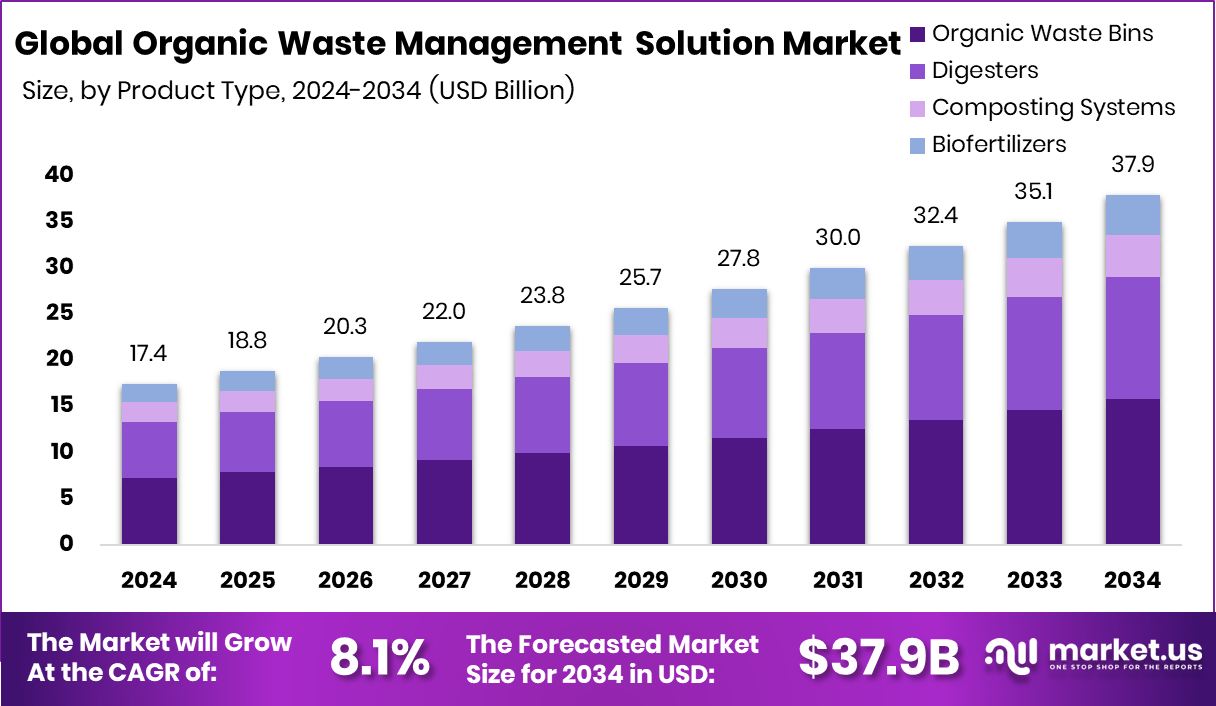 - The Global Organic Waste Management Solution Market is expected to be worth around USD 37.9 billion by 2034, up from USD 17.4 billion in 2024, and is projected to grow at a CAGR of 8.1% from 2025 to 2034.