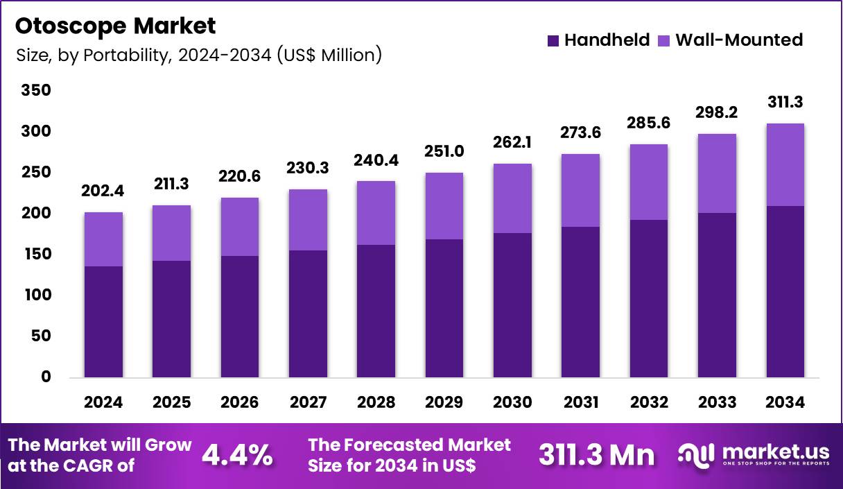 Handheld otoscopes, holding 67.6%, are projected to lead portability demand as clinicians prioritize flexibility and ease of use across multiple care settings. Handheld devices support rapid examinations in outpatient clinics, emergency rooms, and bedside care. Their lightweight design reduces user fatigue during repeated use. Primary care physicians and pediatricians favor handheld formats for routine ear assessments.