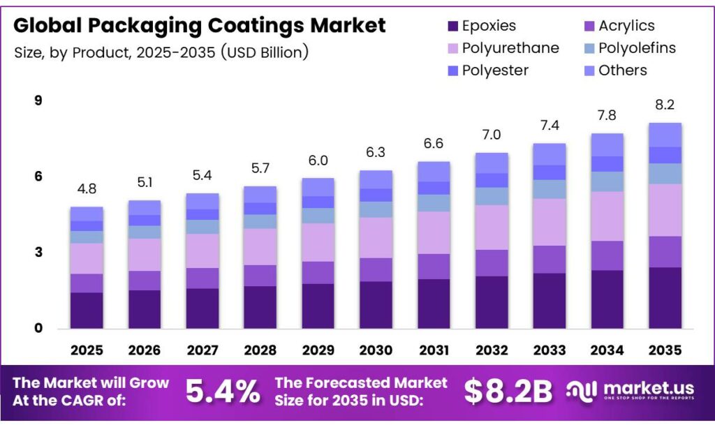 - The Global Packaging Coatings Market was valued at USD 4.8 billion in 2025 and is forecast to reach USD 8.2 billion by 2035 at a CAGR of 5.4% during the forecast period 2026 to 2035.