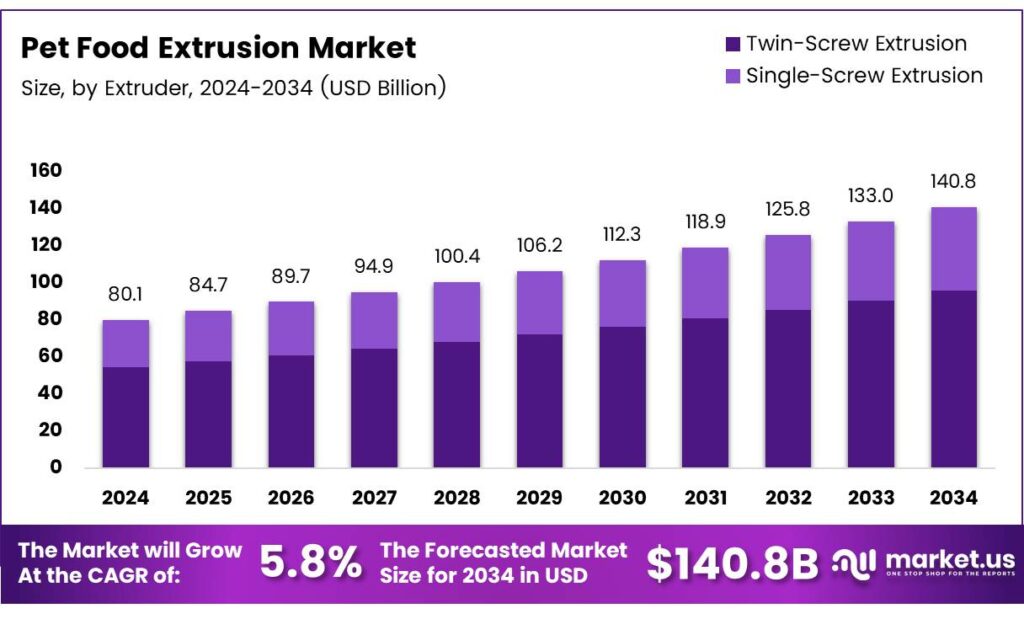 - The Global Pet Food Extrusion Market is projected to grow from USD 80.1 billion in 2024 to USD 140.8 billion by 2034, registering a 5.8% CAGR during 2025–2034.