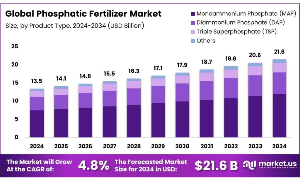 - The global phosphatic fertilizer market is projected to grow at a CAGR of 4.8% and is estimated to reach USD 21.6 billion by 2034.