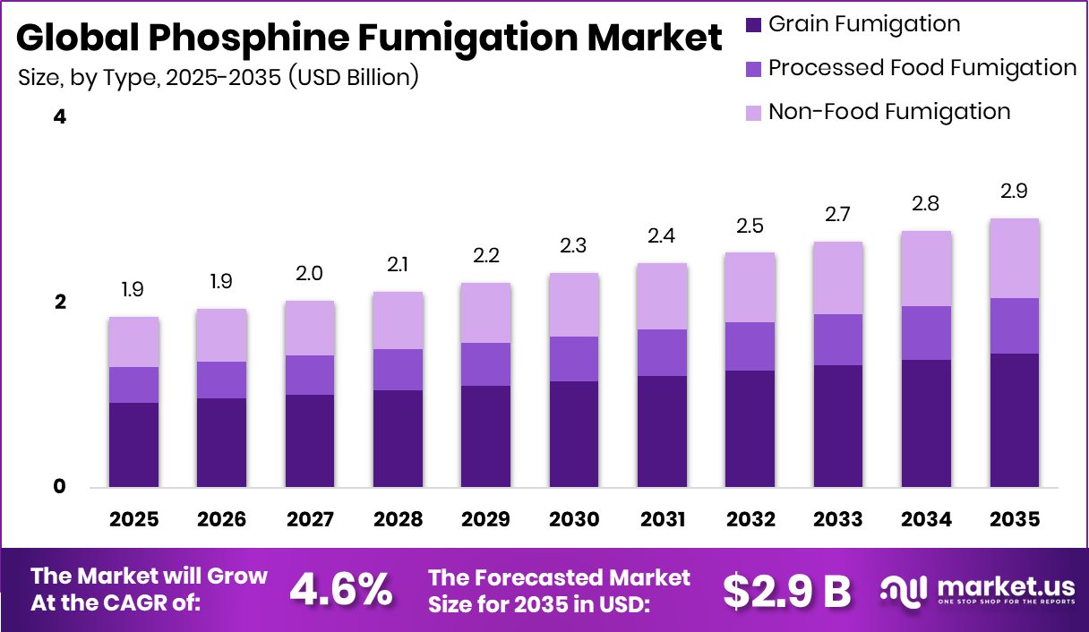 - The Global Phosphine Fumigation Market is expected to be worth around USD 2.9 billion by 2034, up from USD 1.9 billion in 2024, and is projected to grow at a CAGR of 4.6% from 2025 to 2034.