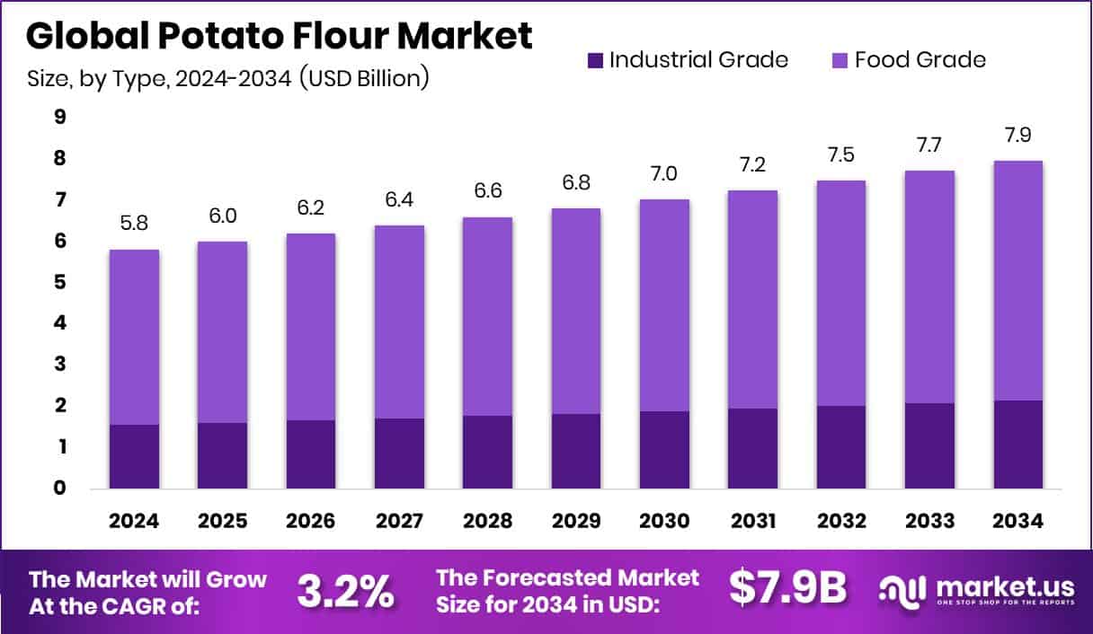 - The Global Potato Flour Market is expected to be worth around USD 7.9 billion by 2034, up from USD 5.8 billion in 2024, and is projected to grow at a CAGR of 3.2% from 2025 to 2034.