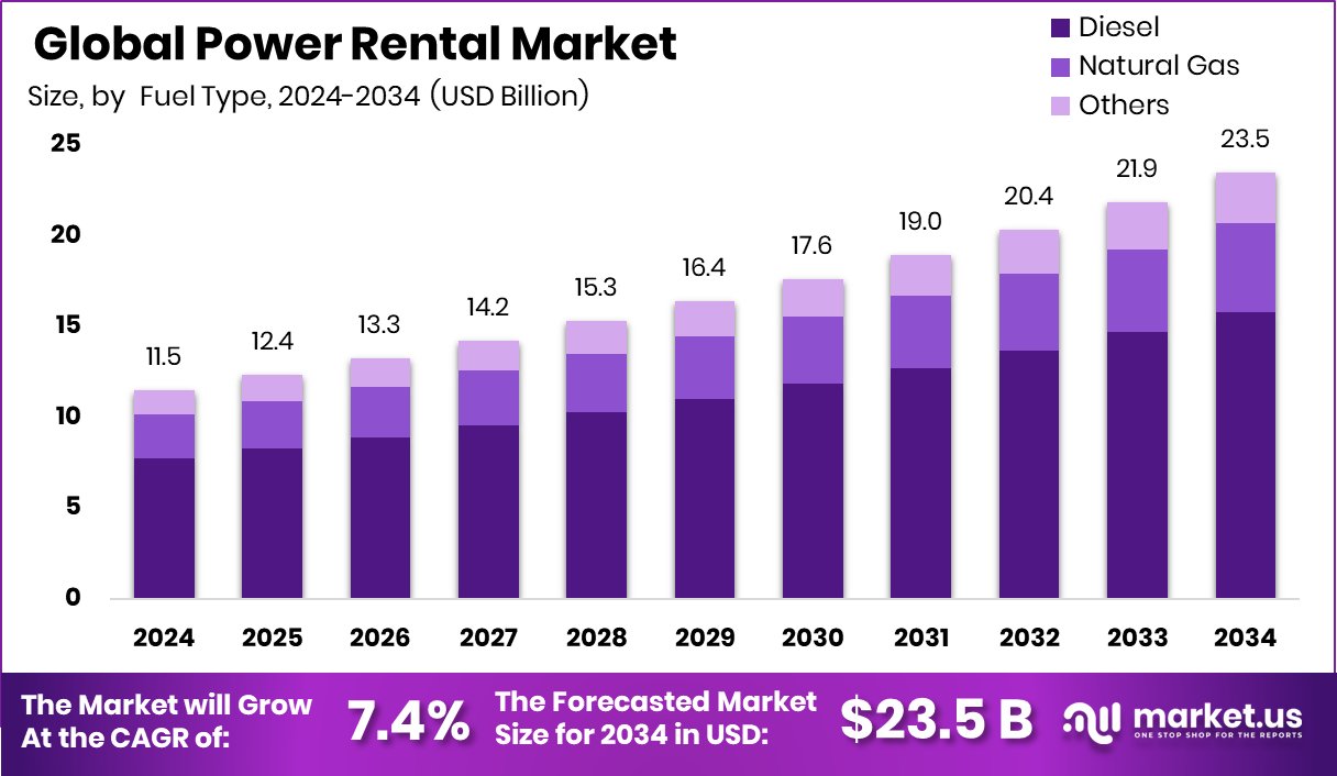 - Global Power Rental Market is expected to be worth around USD 23.5 billion by 2034, up from USD 11.5 billion in 2024, and grow at a CAGR of 7.4% from 2025 to 2034.