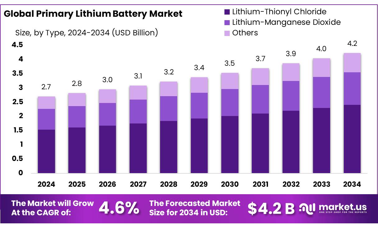 - Primary Lithium Battery Market size is expected to be worth around USD 4.2 Billion by 2034, from USD 2.7 Billion in 2024, growing at a CAGR of 4.6%.