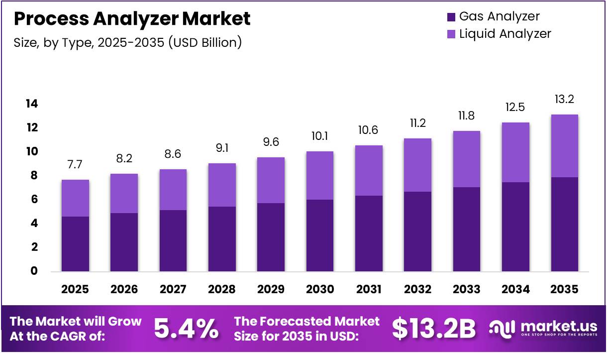 The Global Process Analyzer Market size is expected to be worth around USD 13.2 Billion by 2035 from USD 7.7 Billion in 2025, growing at a CAGR of 5.4% during the forecast period 2026 to 2035.