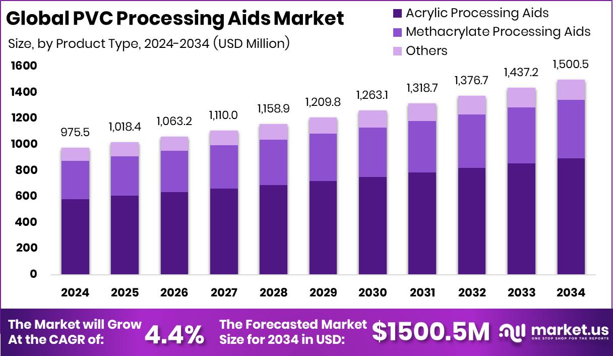 - The Global PVC Processing Aids Market is expected to be worth around USD 1500.5 million by 2034, up from USD 975.5 million in 2024, and is projected to grow at a CAGR of 4.4% from 2025 to 2034.