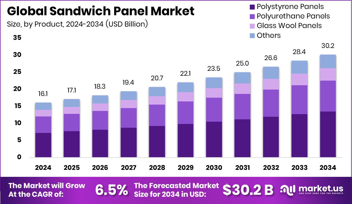 - The Global Sandwich Panel Market is expected to be worth around USD 30.2 billion by 2034, up from USD 16.1 billion in 2024, and is projected to grow at a CAGR of 6.5% from 2025 to 2034.