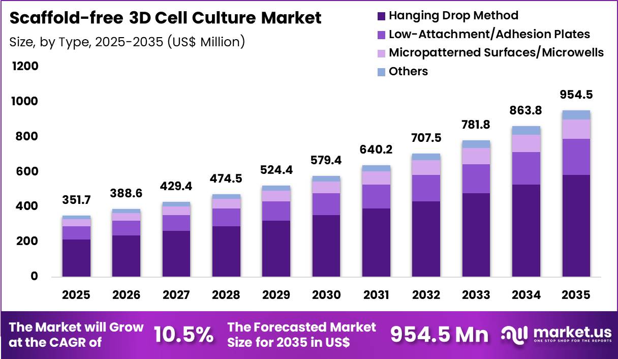 Hanging drop method accounted for 61.3% of growth within type and dominate the scaffold-free 3D cell culture market due to its simplicity, reproducibility, and strong suitability for spheroid formation without requiring external scaffold materials.