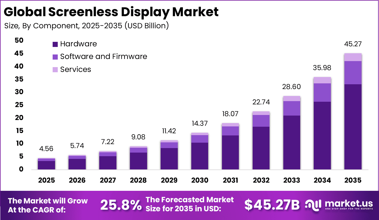 Global Screenless Display Market Size, Share and Analysis By Component (Hardware, Software and Firmware, Services), By Technology (Visual Image Displays, Retinal Projection Displays, Synaptic/Direct-Neural Interface), By Display Type (Head-Up Display (HUD), Head-Mounted Display (HMD), Holographic Projection Kiosks, Implantable and Wearable Micro-Projectors), By End-user Industry (Consumer Electronics, Automotive, Aerospace and Defense, Healthcare and Life-Sciences, Industrial and Logistics, Retail and Advertisement, Others), By Regional Analysis, Global Trends and Opportunity, Future Outlook By 2025-2035