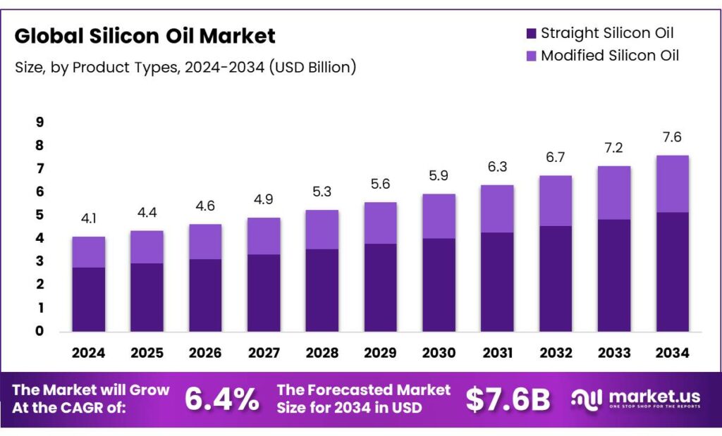 - Silicon Oil Market size is expected to be worth around USD 7.6 Billion by 2034, from USD 4.1 Billion in 2024, growing at a CAGR of 6.4%.