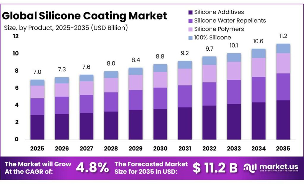 - Silicone Coating Market size is expected to be worth around USD 11.2 Billion by 2035, from USD 7.0 Billion in 2025, growing at a CAGR of 4.8%.