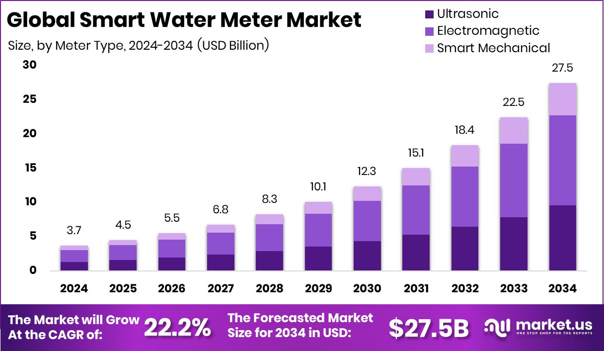 - The Global Smart Water Meter Market is expected to be worth around USD 27.5 billion by 2034, up from USD 3.7 billion in 2024, and is projected to grow at a CAGR of 22.2% from 2025 to 2034.
