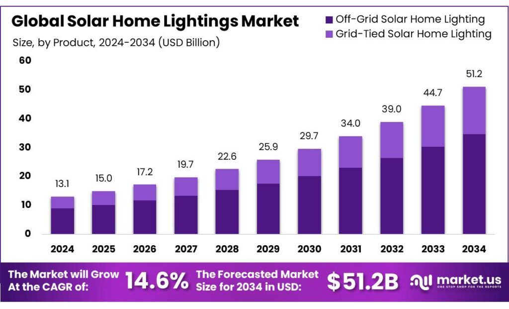 - Solar Home Lightings Market size is expected to be worth around USD 51.2 Billion by 2034, from USD 13.1 Billion in 2024, growing at a CAGR of 14.6%.