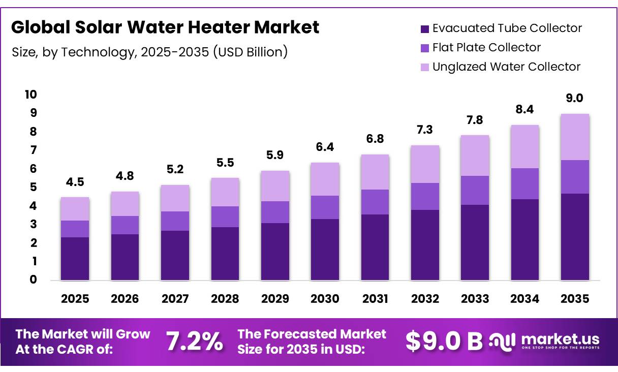 - The global solar water heater market was valued at USD 4.5 billion in 2025.