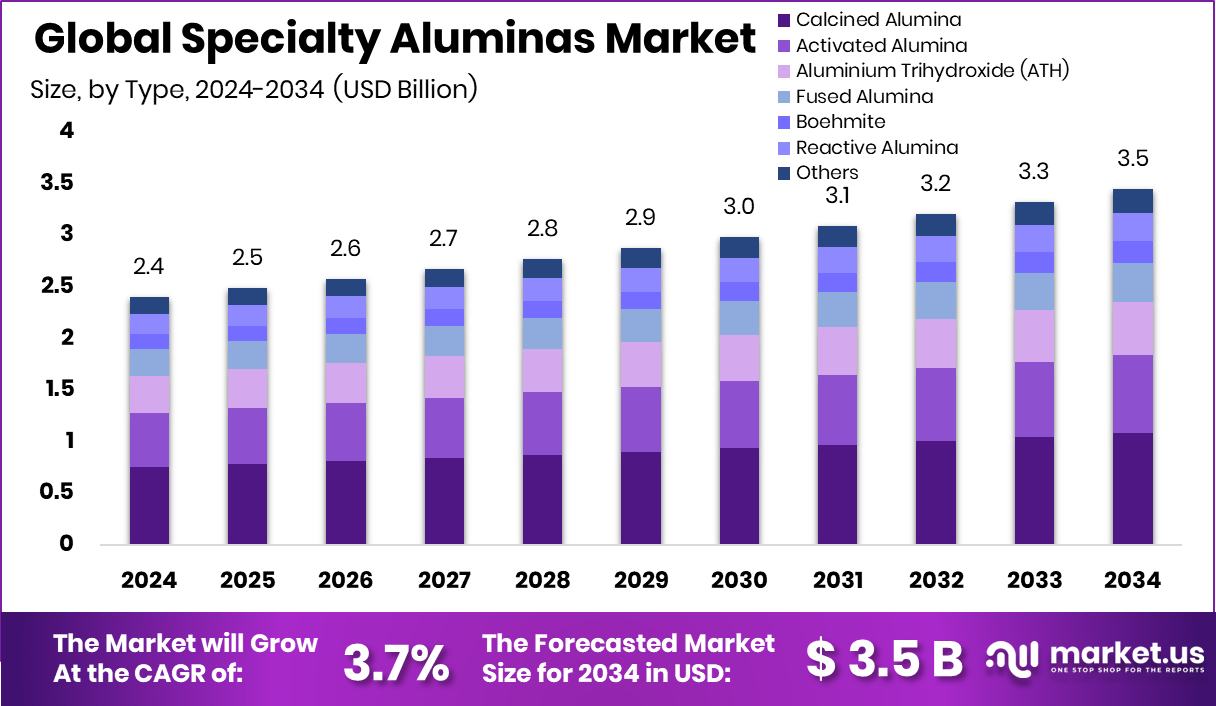 - Global Specialty Aluminas Market is expected to be worth around USD 3.5 billion by 2034, up from USD 2.4 billion in 2024, and grow at a CAGR of 3.7% from 2025 to 2034.