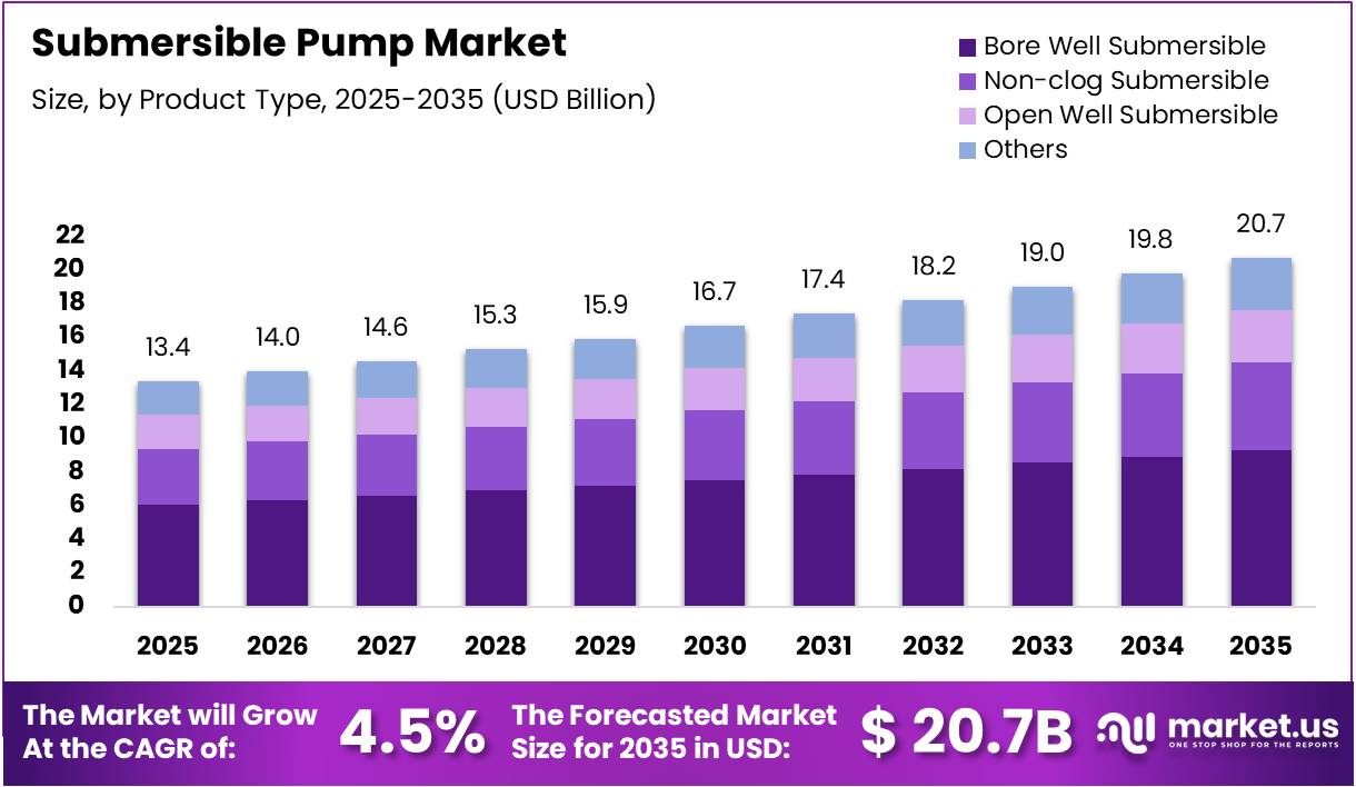 The Global Submersible Pump Market size is expected to be worth around USD 20.7 Billion by 2035 from USD 13.4 Billion in 2025, growing at a CAGR of 4.5% during the forecast period 2026 to 2035.