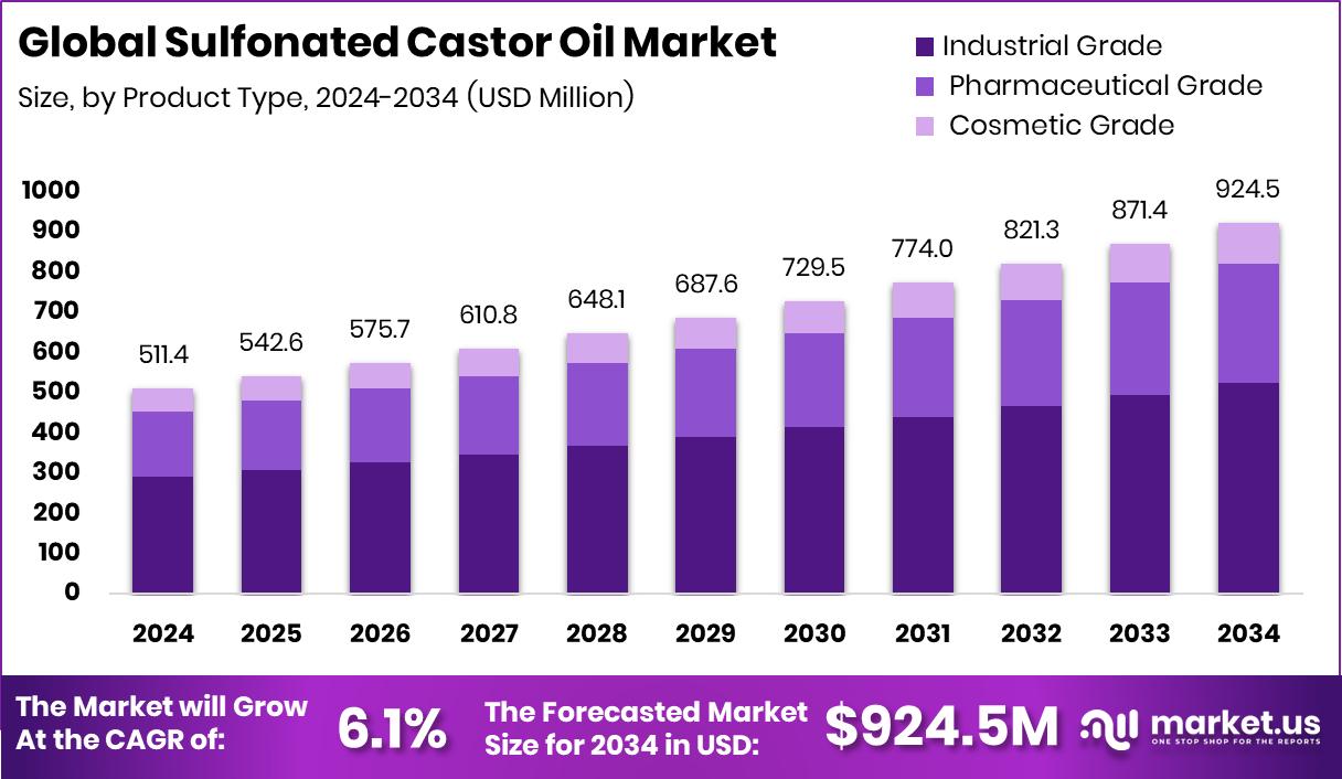 - The Global Sulfonated Castor Oil Market is expected to be worth around USD 924.5 million by 2034, up from USD 511.4 million in 2024, and is projected to grow at a CAGR of 6.1% from 2025 to 2034.