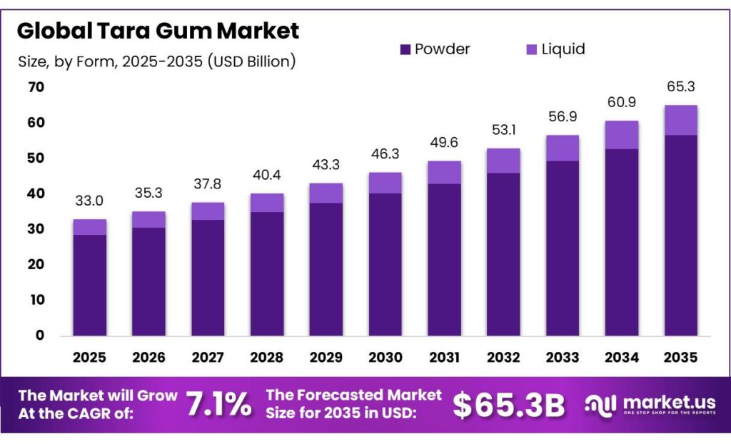 - Tara Gum Market size is expected to be worth around USD 65.3 Billion by 2035, from USD 33.0 Billion in 2025, growing at a CAGR of 7.1%.