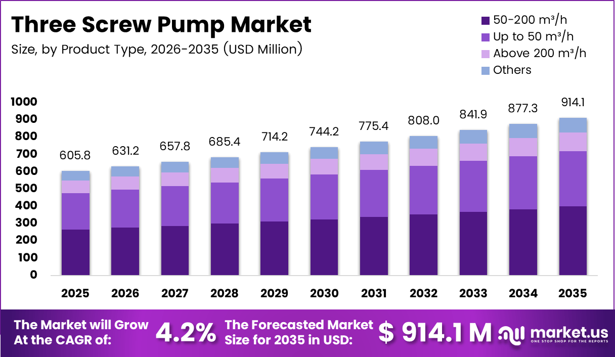 The Global Three Screw Pump Market size is expected to be worth around USD 914.1 million by 2035, from USD 605.8 Million in 2025, growing at a CAGR of 4.2% during the forecast period from 2026 to 2035.