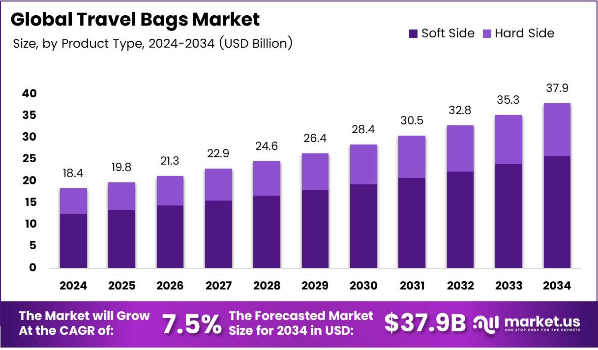 The Global Travel Bags Market size is expected to be worth around USD 37.9 Billion by 2034, from USD 18.4 Billion in 2024, growing at a CAGR of 7.5% during the forecast period from 2025 to 2034.
