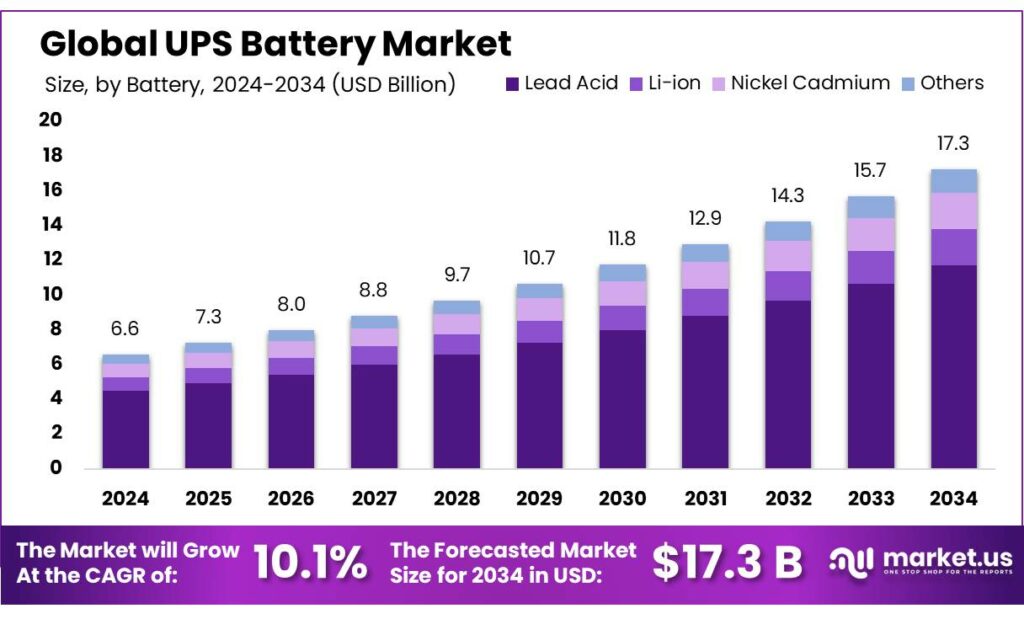 - UPS Battery Market size is expected to be worth around USD 17.3 Billion by 2034, from USD 6.6 Billion in 2024, growing at a CAGR of 10.1%