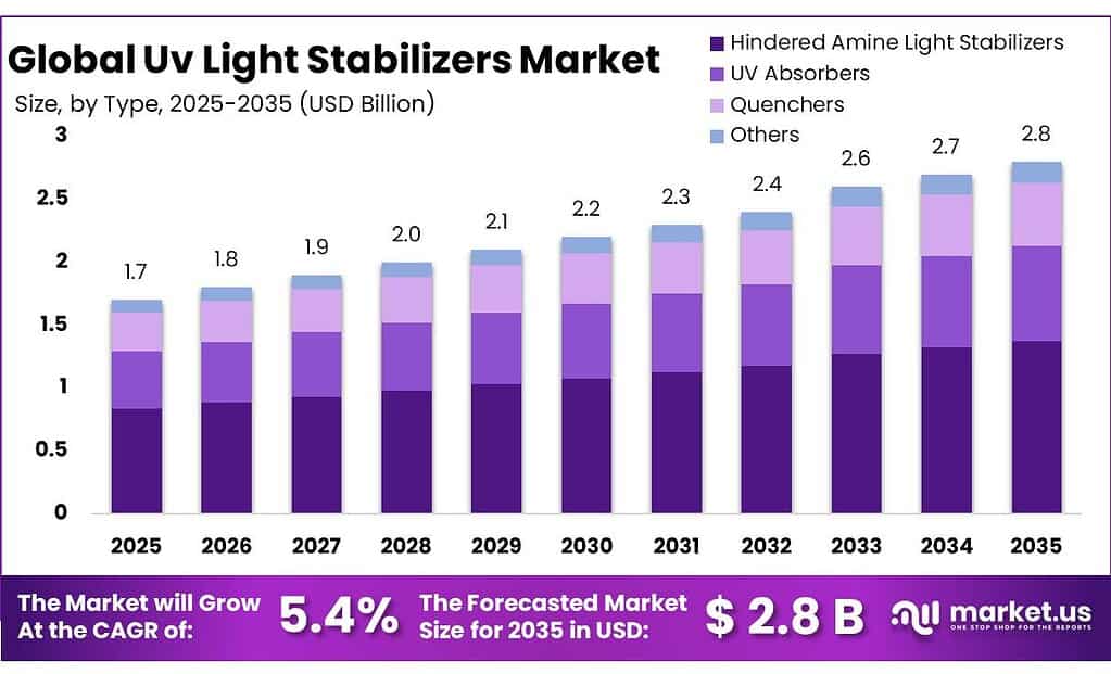 - Uv Light Stabilizers Market size is expected to be worth around USD 2.8 Billion by 2035, from USD 1.7 Billion in 2025, growing at a CAGR of 5.4%.