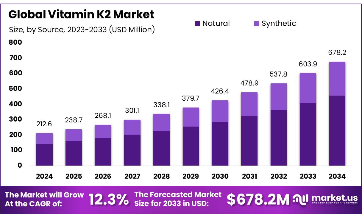 - Vitamin K2 Market size is expected to be worth around USD 678.2 Million by 2034, from USD 212.6 Million in 2024, growing at a CAGR of 12.3%.
