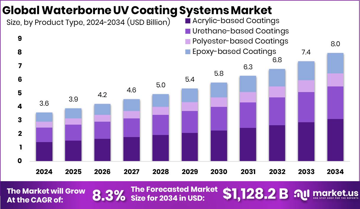 - The Global Waterborne UV Coating Systems Market is expected to be worth around USD billion by 2034, up from USD 3.6 billion in 2024, and is projected to grow at a CAGR of 8.3% from 2025 to 2034.