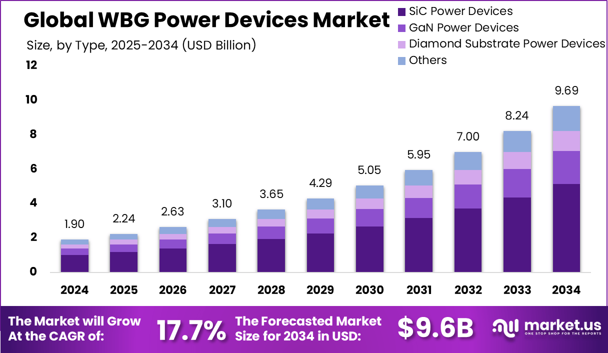 - WBG Power Devices Market size is expected to be worth around USD 9.7 Bn by 2034, from USD 1.9 Bn in 2024, growing at a CAGR of 17.7%.