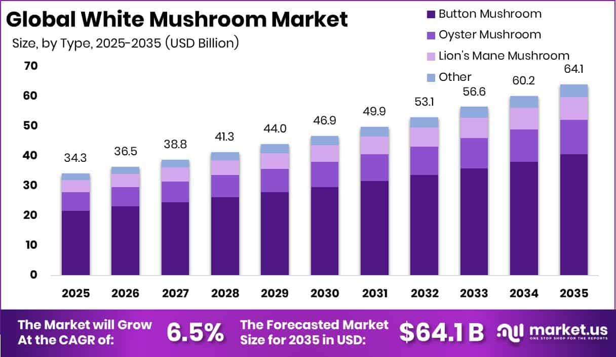 - The Global White Mushroom Market is expected to be worth around USD 64.1 billion by 2034, up from USD 34.2 billion in 2024, and is projected to grow at a CAGR of 6.5% from 2025 to 2034.