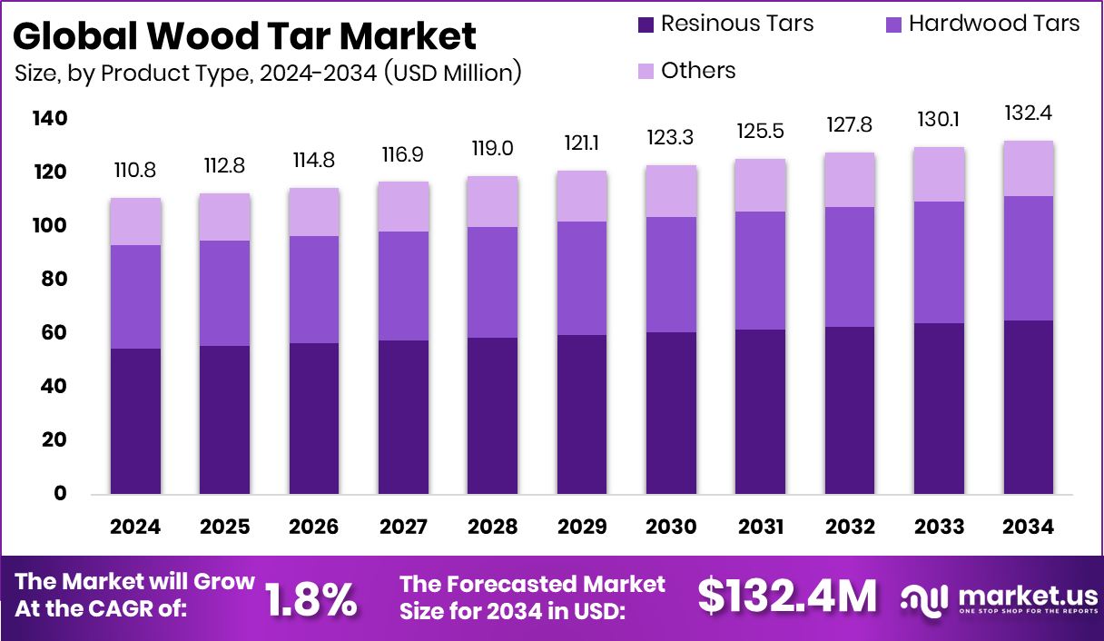 - The Global Wood Tar Market is expected to be worth around USD 132.4 million by 2034, up from USD 110.8 million in 2024, and is projected to grow at a CAGR of 1.8% from 2025 to 2034. In 2024,