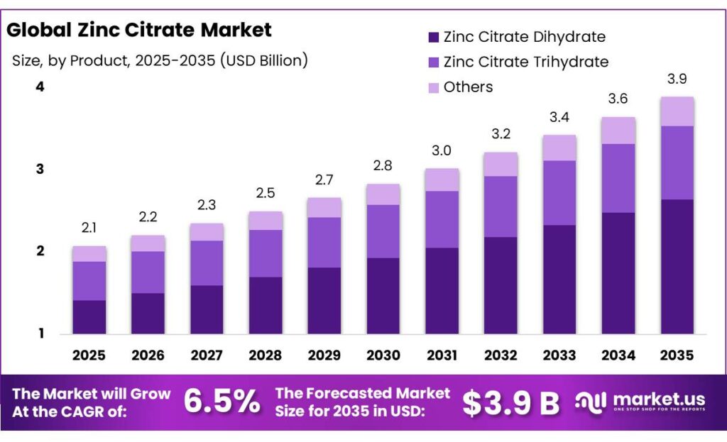 - Zinc Citrate Market is expected to be worth around USD 3.9 Billion by 2035, up from USD 2.1 Billion in 2025, at a CAGR of 6.5%.