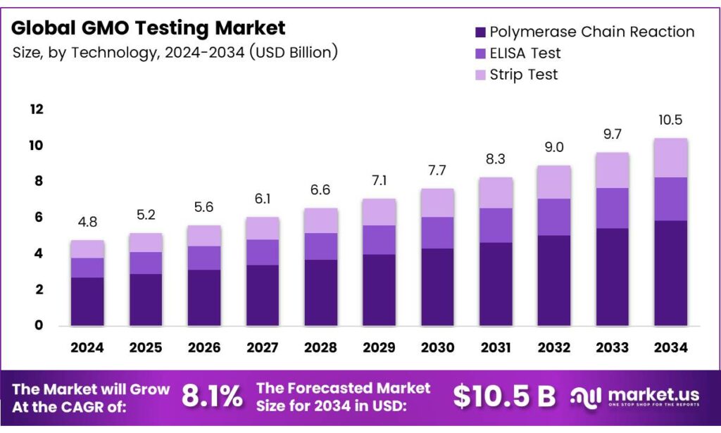 - The Global GMO Testing Market is expected to grow from USD 4.8 billion in 2024 to USD 10.5 billion by 2034 at 8.1% CAGR (2025-2034).