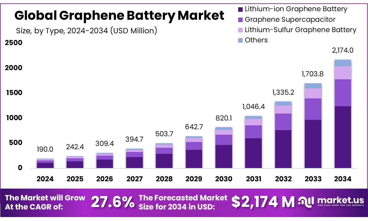 - Graphene Battery Market size is expected to be worth around USD2174.0 Mn by 2034, from USD 190.0 Mn in 2024, growing at a CAGR of 27.6%.