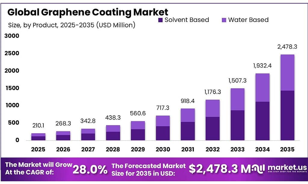 - Graphene Coating Market size is expected to be worth around USD 2,478.3 Million by 2035, from USD 210.1 Million in 2025, growing at a CAGR of 28.0%.