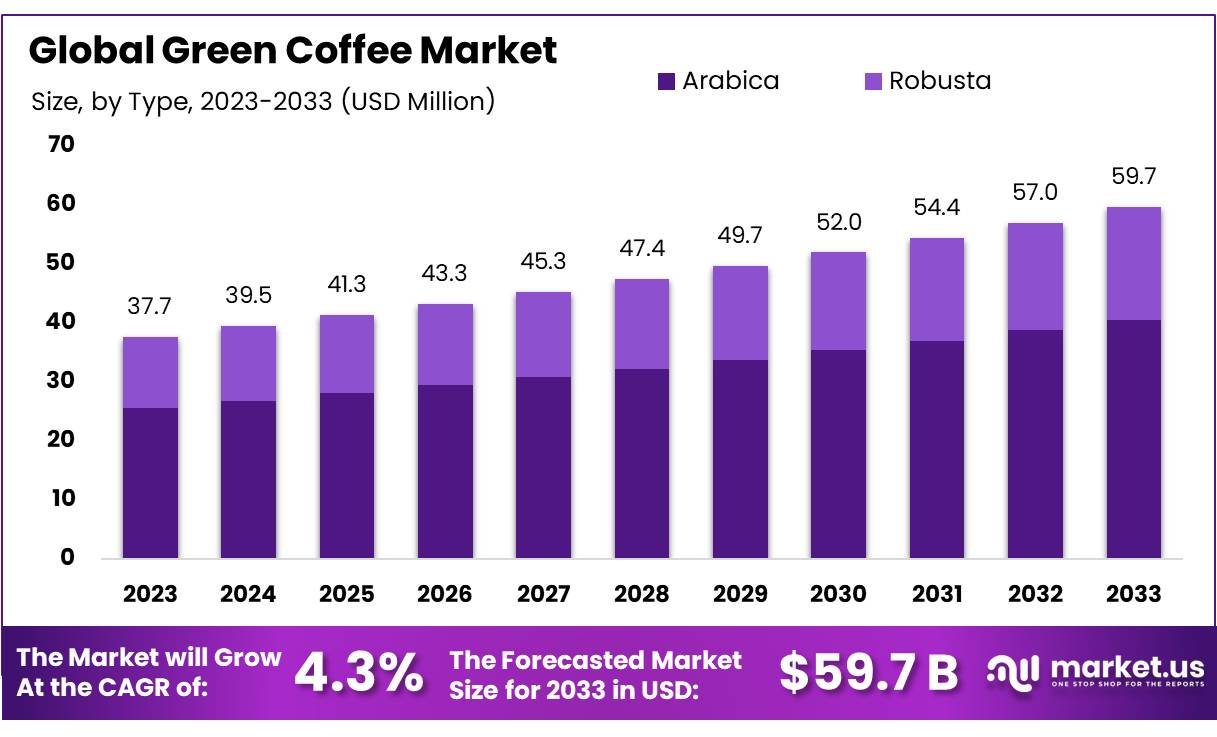 The Global Green Coffee Market size is expected to be worth around USD 59.7 Bn by 2033, from USD 37.7 Bn in 2023, growing at a CAGR of 4.3% during the forecast period from 2024 to 2033.